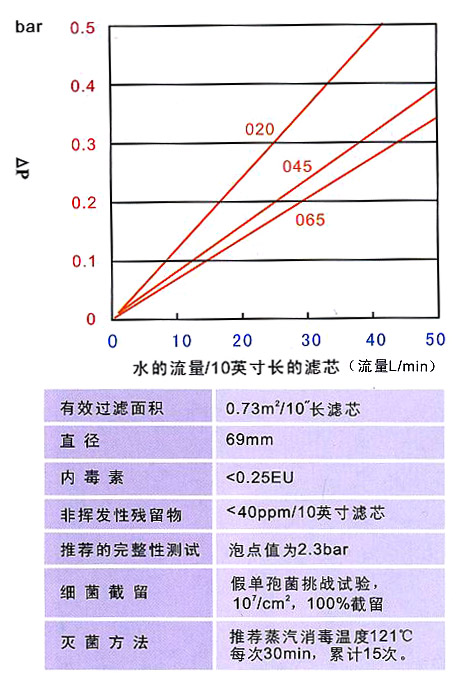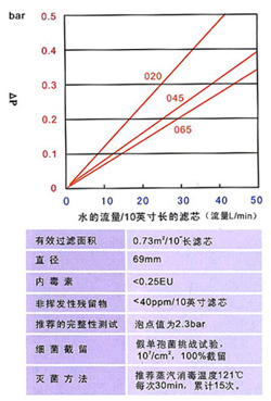 20℃時,最大操作壓差5.5bar 50℃時,最大操作壓差5.3bar 80℃時,最大操作壓差4.1bar 最高連續使用溫度80℃ 蒸汽最高滅菌溫度140℃,累計時間72小時。 |
